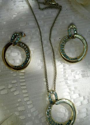 Набор украшений с позолотой и бирюзовыми камушками Выглядит на медицинский сплав Серьги диаметром 2 см Такая же подвеска Цепочка длиной 40 см