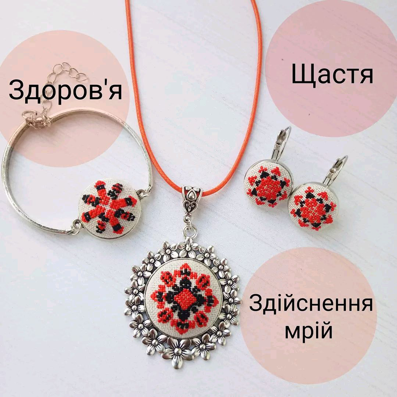 Привіт! Новий подарунковий набір! Коли ми вітаємо, то завжди бажаємо Щастя, Здоров'я, Здійснення Мрій. Тож я вирішила ці побажання закодувати у вишивку. На кулоні "Здійснення Мрій", на сережках "Щастя", на браслеті "Здоров'я". Таким чином Ваші побажання завжди будуть з близькими людьми. Вишито шовком на натуральному льоні! В наявності!