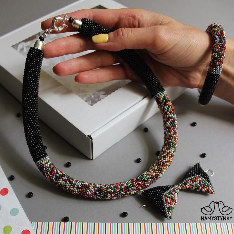 Комплект украшений (жгут, серьги и браслет), выполненный чешским бисером и прочной нитью Товар под заказ