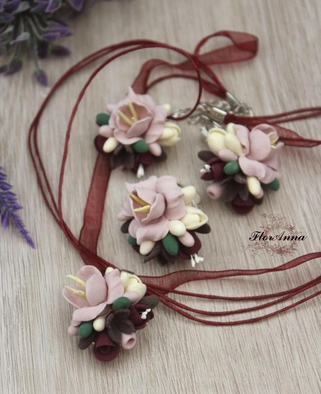 Шикарный авторский комплект "Совиньон" совмещает в себе благородные оттенки бордо, шоколада и айвори. Композиция состоит из фрезии роз и бутончиков. Каждый цветочек слеплен вручную из очень легкой японской самоотвердевающей полимерной глины decoclay. Размер кулона 3,5см-3,5см. Серьги 2,5х3см Длина колье регулируется. Общая длина с цепочкой 44 см