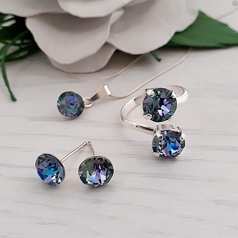 Очень эффектный, сияющий комплект (серьги-гвоздики, кулон и кольцо) ручной работы с оригинальными кристаллами Сваровски бриллиантовой огранки. Цвет из лимитированной серии кристаллов Swarovski - Aquamarine Vitrail Light - описать его невозможно - есть зеленые, синие, бирюзовые, розовые и сиреневые оттенки (розовые и сиреневые в середине кристалла). Сверкает, как бриллиант! Размер кристаллов 8 мм Размер кольца примерно 17-17.5 Фурнитура на гвоздиках и кулоне – серебро 925. Фурнитура на кольце – латунь, покрытая серебром. Фурнитура производства Евросоюза.
