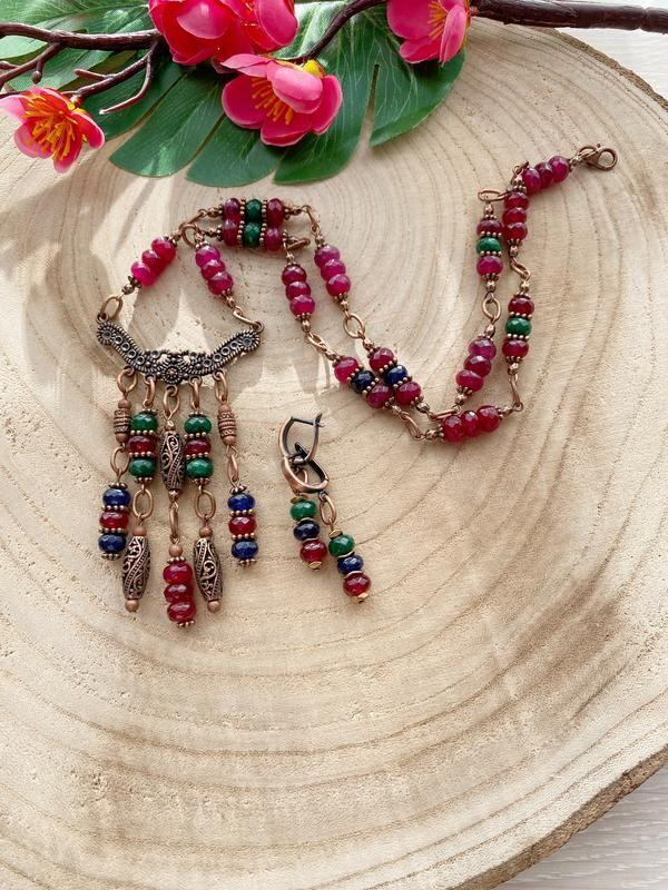 Комплект прикрас нагадує про вишуканий колорит та таємничість східних країн, де відбивається багатство і різноманітність культур. Колірна гама відображає красу природи та національного вбрання, із синім, зеленим та бордовим кольорами, що символізують світ, гармонію та вітчизняну духовність. Дует чудово підходить для повсякденного вбрання та для особливих випадків, коли вам хочеться створити образ загадковості та екзотики. Довжина намиста 64 см + подовжувальний ланцюжок. Сережки 5 см.