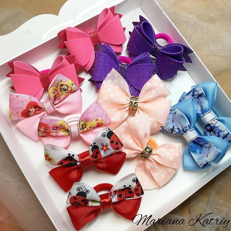 Набір резиночок для маленької дівчинки. До складу набору входить: - дві пари сяючих бантиків з глітерного фоамірану, розміром 7см., закріплені на маленькі резиночки. - 4 пари бантиків з репсових стрічок, закріплені на маленькі резиночки, розміром 7см. Ціна вказана за набір, оформлений в коробочку.