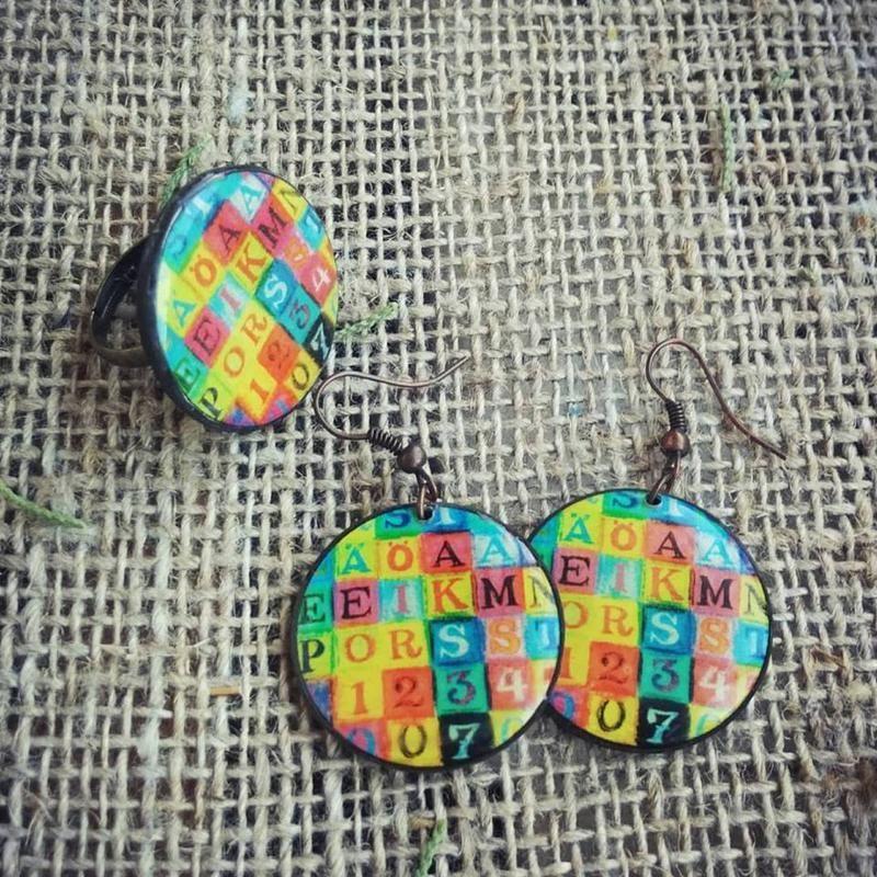 Комплект из кольца и сережек. Диаметр изображения 28мм, основа из полимерной глины, покрытие ювелирной эпоксидной смолой. Кольцо безразмерное, регулируется. #буквы #цифры #цветной #комплект #набор #украшения #кольцо #серьги #сережки #саморобинки #скороновыйгод #рукоделие #handmade