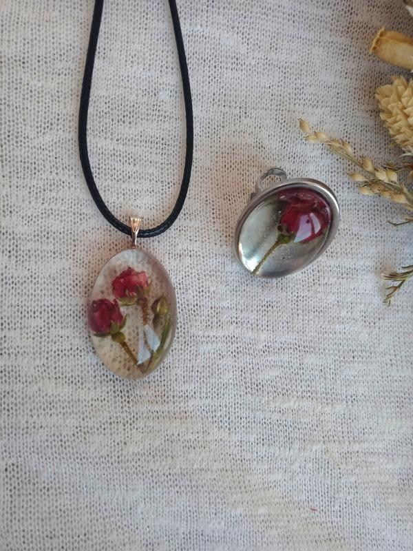Набор украшений с розами в смоле. Каблочная основа нержавеющая сталь, регулируется. Размер вставки 25*18 мм Кулончик вставка 20*30 мм, шнур вощений 45+5 см
