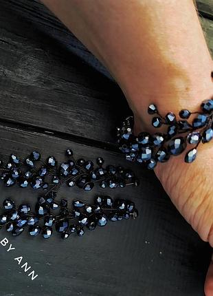 Сережки і браслет ручної роботи створені з кришталевих намистин і ювелірної дроту. Красиво переливаються. Для повного комплекту можу запропонувати прикраса для волосся.