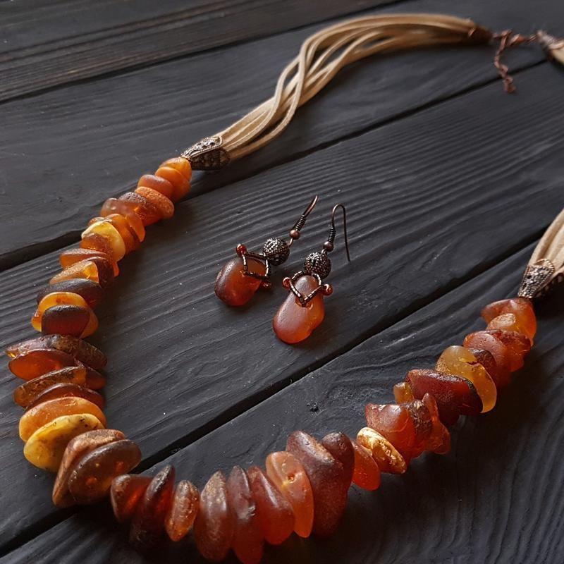 Комплект з натуральним янтарем кольє, сережки бохо бусы из натурального янтаря серьги из я...