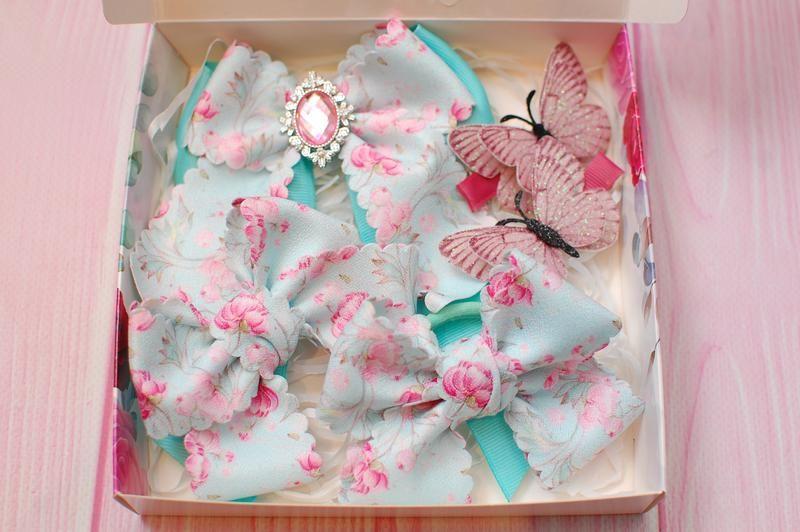 Набір прикрас виконаний у м*ятному кольорі. Чудовий подарунок на будь-яке свято Набір складається: 1. бантик з квіткової стрічки (основа - заколка) розміром 10,5*14,5 см 2. бантики з квіткової стрічки (основа - резинки) розміром 10*7,5 см 3. заколки з метеликами розміром 5,5*4 см Всі прикраси упаковані у святкову коробочку розміром 15*15*3 см.