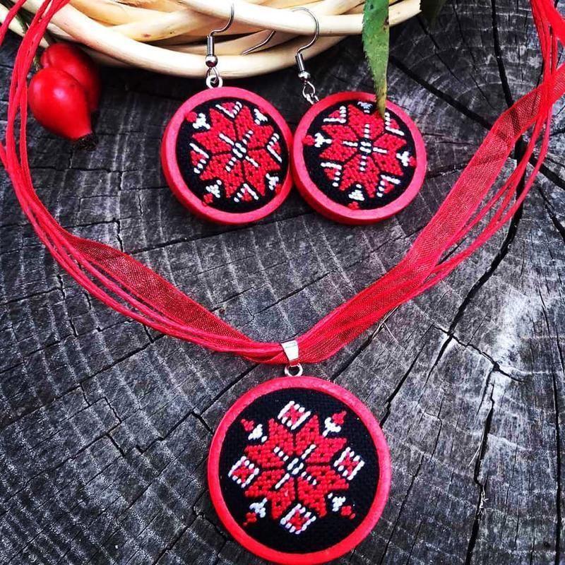 Микровишивка в сочетании с деревянной фурнитурой выглядит стильно и современно. Комплект станет прекрасным дополнением как для праздничного, так и для ежедневного образа.