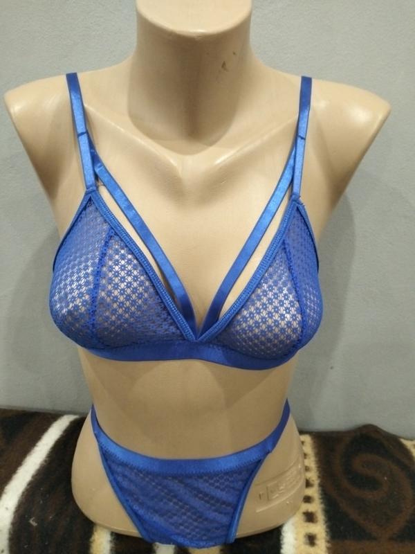 Комплект, синего цвета, кружевной, без паралона, без косточки, размер бюстика 75В (34В), размер трусики бикини М,размер поясочка М, состояние почти новое