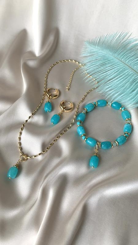Идеально для лета. Яркий, акцентный. Амазонит, гематит, латунь в позолоте. Все объединилось в одном наборе. Браслет 550 грн Серьги 550 грн Позолоченная цепочка с подвеской 550 грн