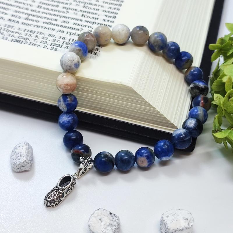 Браслет королевского, синего цвета из натуральных камней содалит с подвеской-башмачком свя...