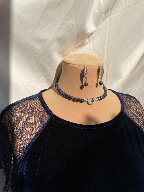 Элегантный набор украшений выполнен из натуральных черных жемчужин. Фурнитура-сплав латуни с родиевым покрытием. Застежка и основание серег инкрустированы фианитами. Длина 39см. ВАЖЛИВО! Подойдет на тоненькие шейки. Диаметр маленький.