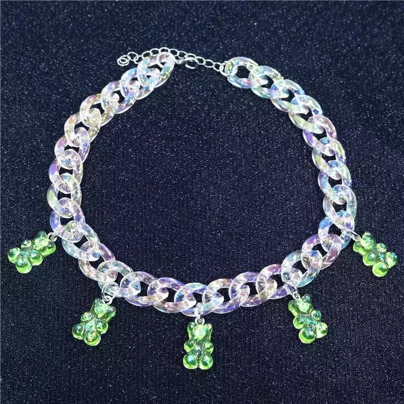 Ожерелье с мишками, цвет салатовый - длина 30см (+9см), смола, цинковый сплав, пластик