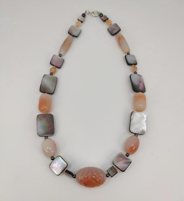 Бусы на струне с натуральным перламутром и агатом. Вес 82.50 грм., длина 54,0 см., ширина центрального резного агата 2,90 см., толщина 1,89 см., замок - карабин.