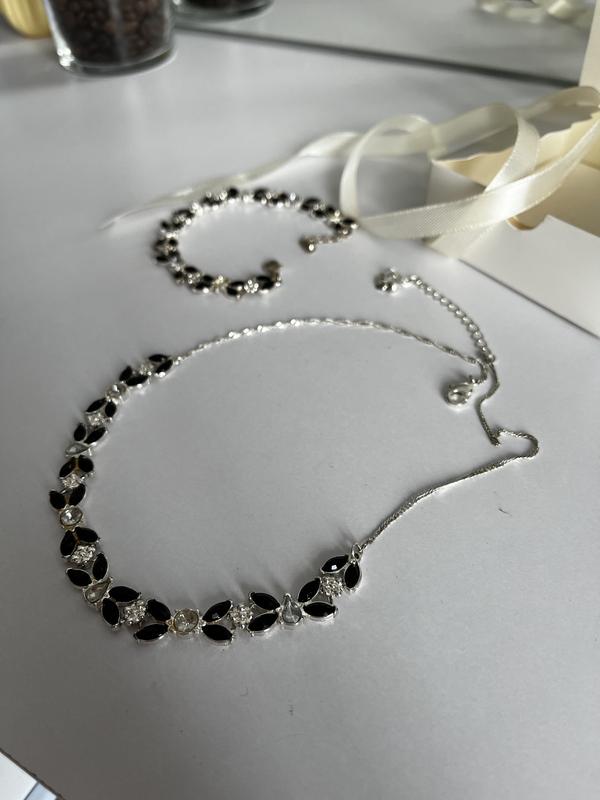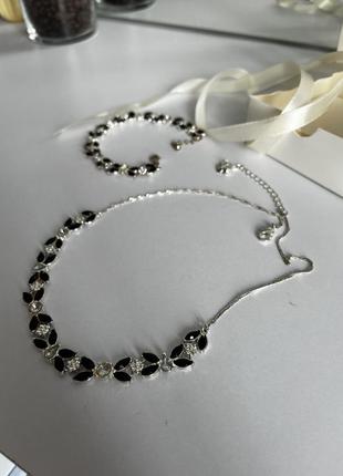 Комплект прикрас кольє та браслет . Дуже красиві в металево срібному оздоблені з прозорими та чорними стразами. Підійдуть для святкових та вечірніх подій. + подарункове упакування