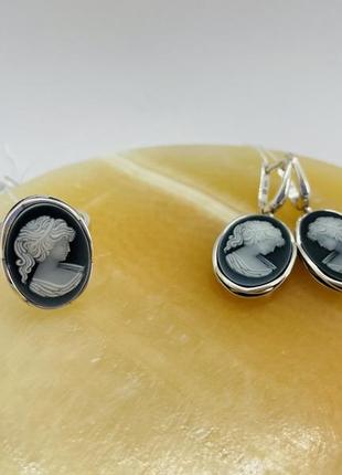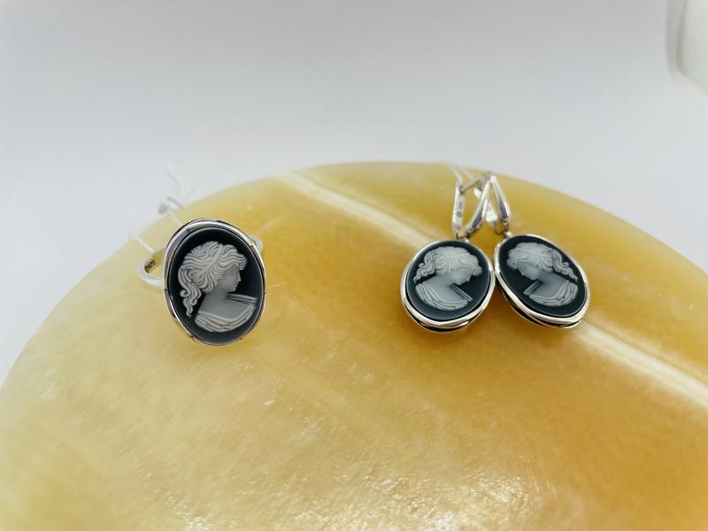 Срібні сережки 925 проба Вага - 5.56 г Вставка- онікс Розмір каменя - 2*1.5 см Довжина- 3.6 см Срібне колечко 925 проба Вага - 4.06 г Вставка- онікс Розмір - уточнюйте Також в наборі є підвіска
