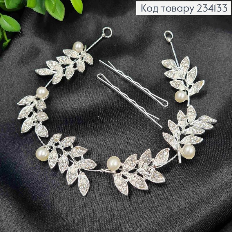 Гілочка у волосся, срібного кольору, листочки з камінчиками та перлинками