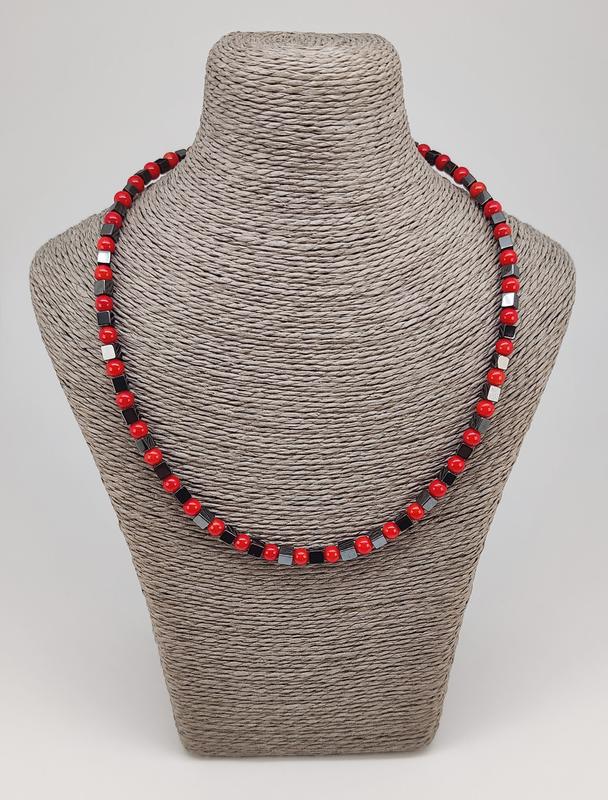 Бусы с натуральными гематитами и красным кораллом. Вес 20.30 грм., длина 40,5 и 42,5 см., форма гематита - куб, цвет -тёмно-серый, цвет коралла - красный, форма - шар, диаметр 5 мм., фурнитура и замок карабин - хорошего качества.