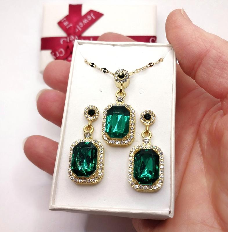 Классический набор украшений "Яркие изумруды в оправе под золото" из бижутерного сплава и крупных цирконов зеленого цвета - оригинальный подарок девушке, красиво упакован в подарочную коробочку Центральный элемент набора - композиция из двух цирконов насыщенного зеленого цвета под натуральный камень изумруд. У основания сережек и кулона расположены крупные цирконы, сверху их дополняют изящные небольшие цирконы. Оба камня нежно украшены дорожками из миниатюрных цирконов. Эти маленькие блестящие камни добавляют кулону и серьгам яркость и великолепие, создавая игру света и бликов, когда они украшают свою обладательницу. Вот наши авторские фото и видео, снятые с реальных моделей и украшений: Наши авторские фото и видео охраняются законом! Достоинства данного украшения - Альтернатива дорогим украшениям из серебра, золота и бриллиантов - Подходит и для праздничной обстановки, и для повседневного использования - Удобный и практичный в использовании Этот набор изготовлен из качественного бижутерного сплава под золото. Это отличный выбор для тех, кто хочет выглядеть стильно и элегантно, не переплачивая за золото. Все изделия проходят сертификацию и являются полностью безопасными в использовании. Уход за бижутерией Изделия будут долгое время радовать своих обладателей при правильном уходе и аккуратном обращении. Для этого необходимо: - беречь от повышенных механических нагрузок (трения и давления, ударов, царапин и тому подобное) - избегать контакта с агрессивными химическими веществами, особенно с хлором и серой, ртутью и йодом - снимать украшения перед мытьем посуды, уборкой с применением бытовой химии, а также перед нанесением лака на волосы и крема на кожу Для продления срока службы постарайтесь снимать украшения перед занятием спортом, принятием солнечных ванн, водных процедур и перед сном. Для очистки от загрязнений промойте изделие в воде с жидким мылом или шампунем (можно использовать мягкую зубную щетку), потом - в чистой воде и вытрите мягкой сухой тряпочкой Оформление украшения в базовой комплектации наглядно показано на главном фото на сайте магазина. Размеры изделия небольшие и подходят большинству девушек, женщин (измерения сделаны в ручную и не претендуют на высокую точность): - кулон и серьги: длина 30 миллиметров, ширина 13 миллиметров - цепочка: длина 40 - 45 сантиметров. Мы можем сделать по Вашему запросу замеры изделий в Вашем заказе. Пожалуйста, обратитесь к нам за дополнительной информацией. Вы можете выбрать другой вариант комплектации украшений с помощью дополнительных фото на сайте. Пожалуйста, уточните цену и наличие выбранных вариантов перед оформлением заказа. Кроме того, дополнительно мы можем подобрать для Вас подарочную упаковку (ссылка активная) с учетом ваших пожеланий! Самый популярный вариант упаковки Вы можете увидеть на следующем нашем авторском фото: От такого подарка девушка будет в восторге Оплаченные заказы отправляем из нашего реального магазина в Черкассах. Экспресс - доставка Новой почтой и Укрпочтой по всей Украине! Заказ легко сделать за пару минут, выберите удобный для Вас вариант - оформите заказ на сайте, заполнив простую форму заявки - или напишите нам на *****, ******** или в чат на сайте - или позвоните нам по одному из телефонов, указанных на сайте Почему нам доверяют 1. До оплаты зака