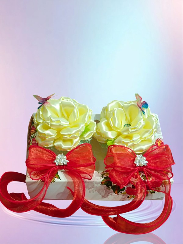 Набор детских украшений. Ручная работа. Розовый цветок на резинке. Красный бант на заколке. Украшения в подарочной упаковке.