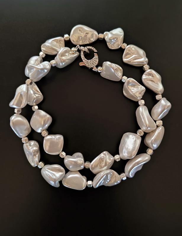 Бусы жемчужные Описание: Жемчуг Shell Pearl, размер бусин 15 - 18 мм на ювелирном тросике. Натуральный камень - гематит граненый Длина изделия 54см Фурнитура премиум класса Жемчуг Shell Pearl - это уникальная, дорогостоящая разработка, которая была изобретена в начале 20 века. Этот жемчуг изготавливается из естественных, природных материалов. Ядро - сфера из раковины моллюска, которая обтесывается специальными резаками, а сверху наносится перламутровая эссенция, изготовленная из растертой в порошок раковины устрицы. Состав покрытия является ключевым условием успеха, который получила эта версия жемчуга. Ядро неоднократно погружается в раствор перламутра и в итоге получается жемчуг с превосходной полировкой и сверкающим перламутровым блеском всех возможных цветов и форм. На сегодняшний день жемчуг Shell Pearl не только очень популярен среди обычных покупателей, он так же является визитной карточкой дома моды Коко Шанель. По красоте он не уступает морскому жемчугу. Особенности жемчуга Shell Pearl: 1. Низкая цена (относительно морского жемчуга) 2. Красивый, яркий блеск 3.Природные материалы не вызывающие аллергию 4. Жемчуг не боится воды, не повреждается от воздействия духов, пота и косметики. 5. Не стираемое, стойкое, перламутровое покрытие.
