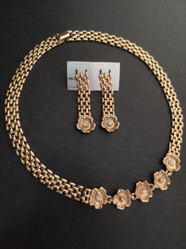 Отличный комплект. Без повреждений и потерь. Глянцева позолота. По центру цветочки стеклянные кристаллы.
