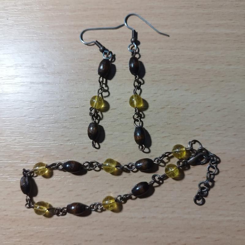 Комплект серьги + каблук. изготовлены из круглых бусин натурального цитрина 6 мм, деревянных "дыжек" из дерева китайский самшит 8*4 мм, медной фурнитуры. Размеры серег около 66 мм, длина браслета 19+5 см удлиняющая цепочка из фурнитурного сплава.