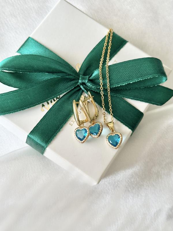 Комплект украшений с голубыми сердечками в подарочной упаковке. стоимость - 670 грн - премиум фурнитура латунь с позолотой, вставки куб.циркония, серьги 2,5 см с английскими застежками, цепочка 50 см, не темнеет, неаллергенно. - также могут быть розовые, зеленые, фиолетовые, синие сердечки