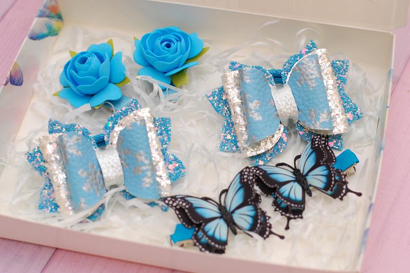 Набор украшений выполнен уголубом цвете. Отличный подарок на день любой праздник Набор состоит: 1. бантики из экокожи (основа - резинки) размером 8*6 см 2. заколки с бабочками из экокожи размером 5*4 см 3. заколки с цветами ручной работы диаметром4,5 см. Все украшения упакованы в праздничную коробочку размером 20*15*3 см.