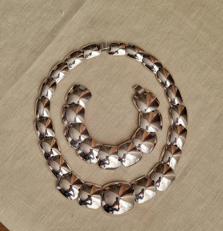 Глядя на этот сет, первое, что приходит в голову, это "Санта Барбара", "Династия", "Диловая женщина" (олды меня поймут:)). Стильный, заметный, яркий сет в серебристом металле. Всегда в моде, всегда на времени:) Отличный рельеф, красивая фактура. Сет без маркировки. Имеет очень хорошее состояние. Востока покрытие, царапин и сколов отсутствуют. Есть одна царапинка на центральной вставке колье, и пара потертостей на других звеньях браслета и колье. Но глянцевость металла это нивелирует. Имеет вес. Длина колье 43см, центральная вставка 3.5смх3см. Длина браслета 18.5см, высота 2.3см.