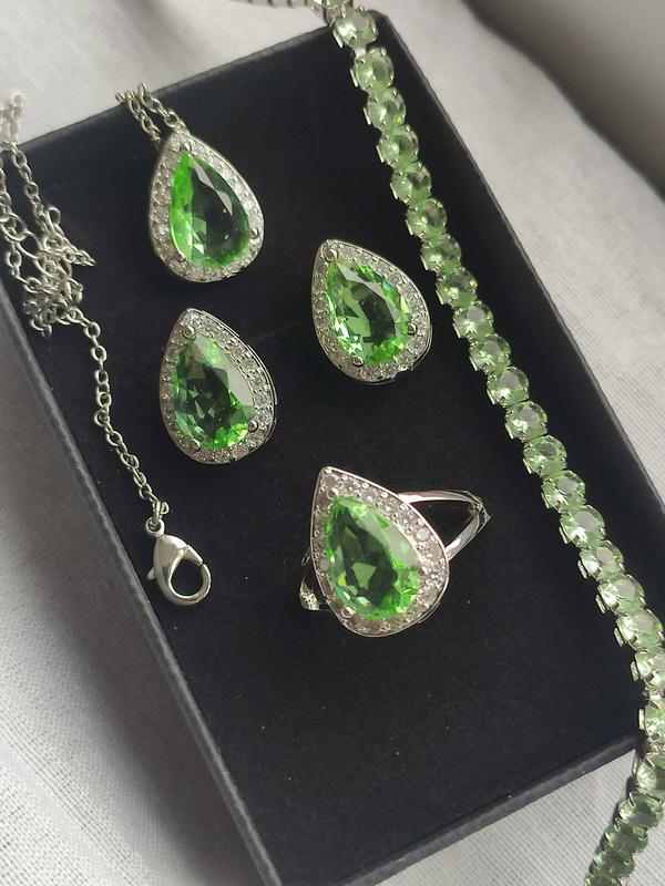 Не великий набор салатним камнем цаворит,кольцо 17.5,18,с пробой 925,кулончік с цепочкой45 см,сережки пусети капельки.В коробочці.Камені салатні..Можливо придбати браслети різні.