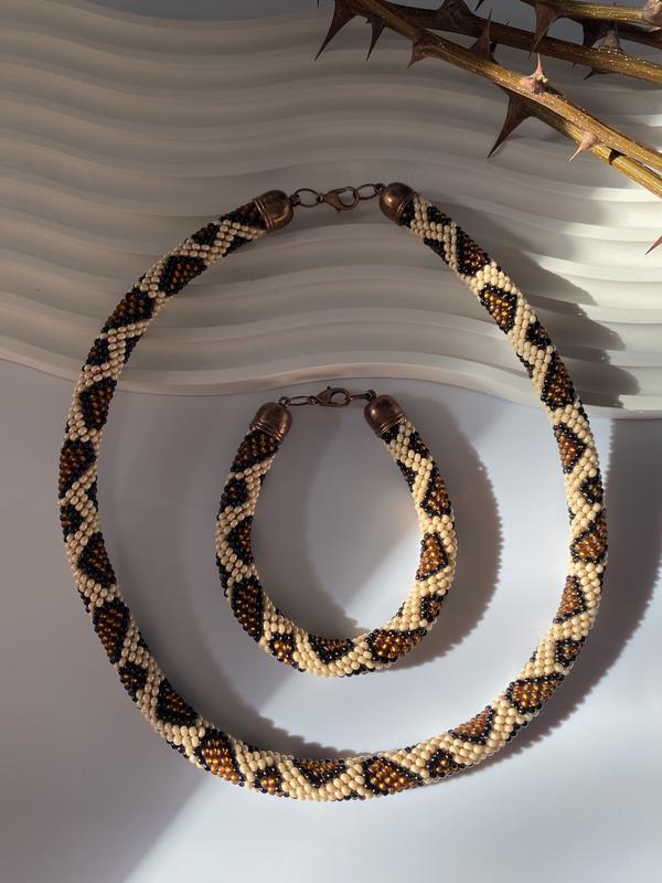 Комплект «Лео» виконаний з чеського бісеру. Довжина джгута 42 см Довжина браслета 17-18 см Діаметр 9 мм