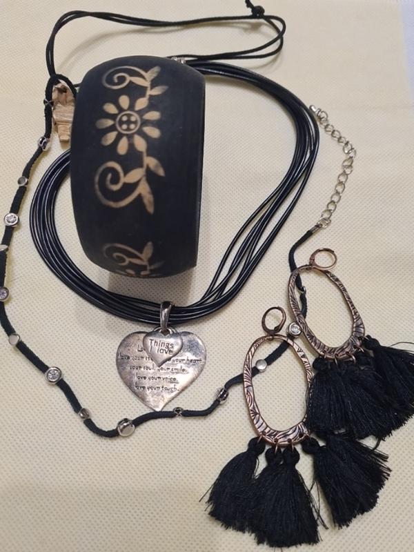 Серьги стан идеальна длина 8.5 см, Браслет из дерева диаметр 6.2 ширина 4 см, Колье с кулоном в форме сердечка 40 см удлинитель 4 см, Бутыло на кожаном шнуре со стразами 40 см + 8 см удлинитель, Подвеска на шнуре 60 см.