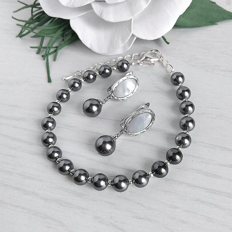 Серьги и браслет ручной работы с оригинальным жемчугом Сваровски в серо-черном глянцевом оттенке (Crystal Dark Grey Pearl). Размер жемчужинок в серьгах 8 мм Длина серег около 26 мм Размер жемчуга в браслете 6 мм Длина браслета 17.5 см + удлиняющая цепочка 5см (примерно на запястье от 15.5 см) Верхушка серег - латунь с родиевым покрытием и натуральным перламутром. Замочки на серьгах - английская застежка. Качество отличное! Браслет собран на ювелирный тросик производства Японии с посеребренной фурнитурой (карабин и цепочка). Между бусинами вставки японского бисера с гальваническим покрытием серебряного цвета.