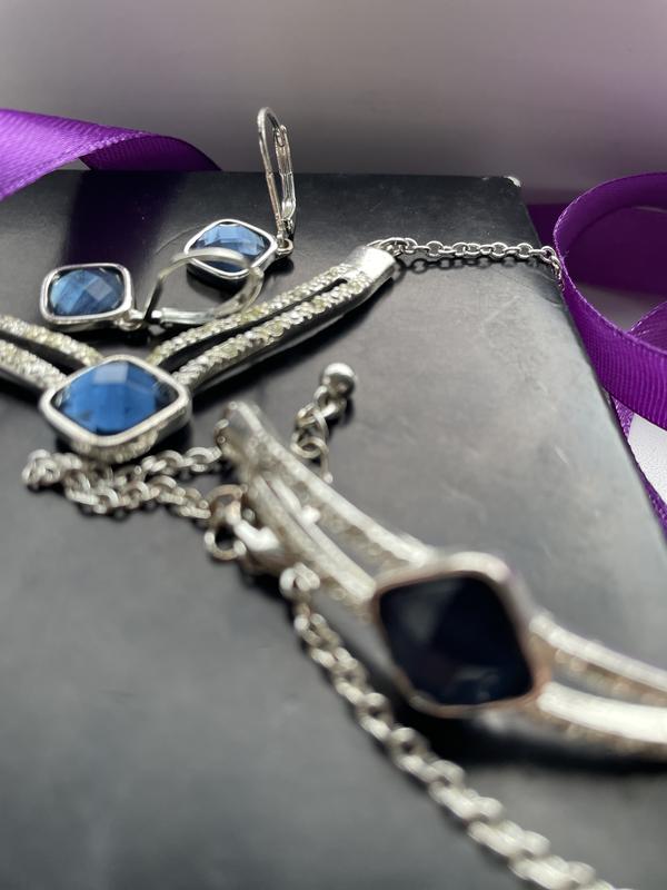 Елегантний набір прикрас з синім каменем Неймовірно стильний комплект, що складається з сережок та кулона на ланцюжку. Срібляста фурнітура прикрашена вишуканими блискучими вставками та глибокими сапфірово-синіми каменями, які красиво переливаються на світлі. Ідеально підходить як для особливих подій, так і для вишуканого щоденного образу. Прекрасний варіант для подарунка — набір вже упакований у стильну подарункову коробочку. Стан: пару разів одягли Матеріал: ювелірний сплав + вставки (імітація каменів) Застібка сережок: зручна застібка-петля Довжина ланцюжка: уточнюйте в повідомленні Запитуйте — надам додаткові фото чи відео! Можлива відправка Новою поштою або Укрпоштою.