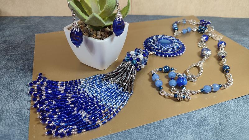 набор колье "Сотуар" и серьги. Длина колье 90см, подвеска 17см (съемная), серьги 4см. фурнитура серебро. кулон-кабошон имитация "кошачий глаз" оплетенный бисером.