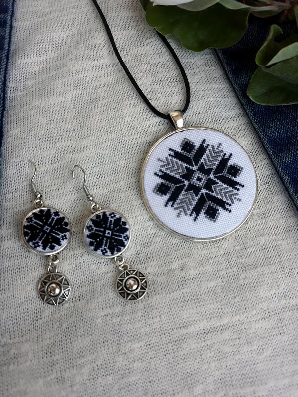 Комплект украшений с микровышивкой крестиком. Кулон диаметр 45 мм Шнур экокожа 50 см Серьги вставка 18 мм