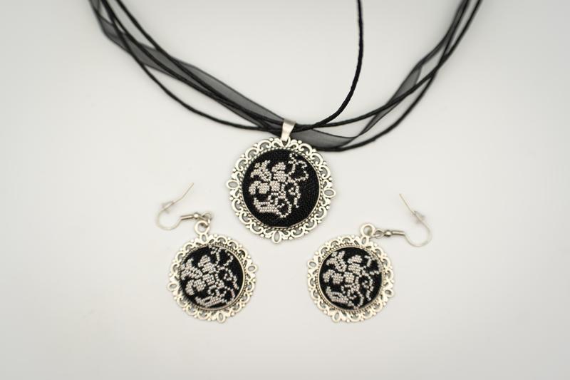 Нежность традиции в современном образе. Этот изящный набор, состоящий из сережек и бусина, поражает сочетанием аутентичной украинской вышивки и элегантного дизайна. В центре каждого элемента — ручная вышивка белыми нитями на черном фоне, выполненная в стиле “белым по черному”