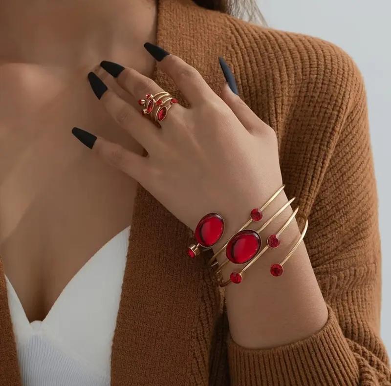 Набор браслетов и колец для женщин в стиле европейского и американского модного дизайна, с красным роскошным цветом, изготовленный из золотого покрытия KC Golden Plated Alloy, подходит для ежедневного ношения в течение всего года, роскошный стиль.