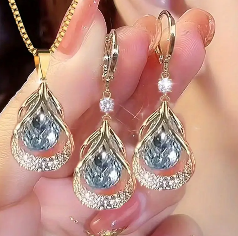 Изысканный набор украшений колье и серьги с имитацией камня "Котячий глаз". Геометрический дизайн в виде капли. Цвет как на первом фото, на втором - размеры.