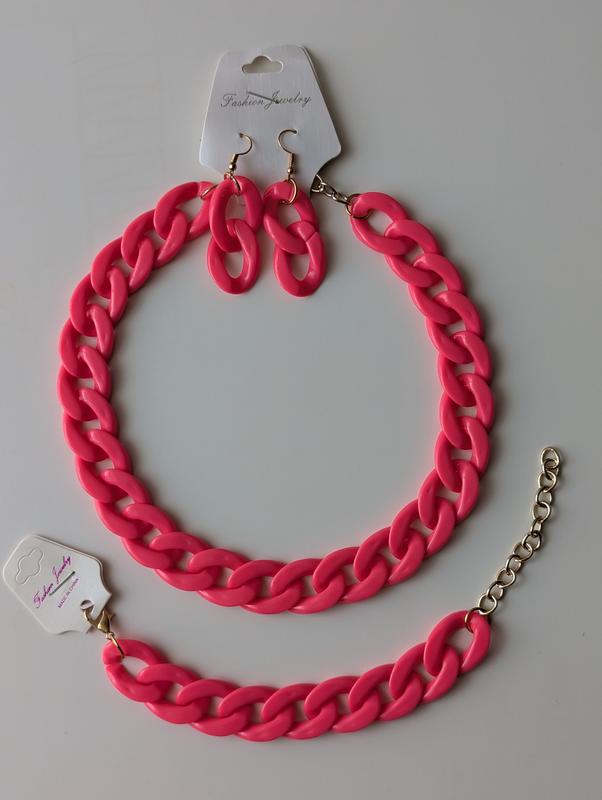 Набір прикрас. Ланцюжок -40 см+5 см, серги-6 см, браслет -17 см+5 см. Колір ярко-рожевий. Прикраси з акрілу,фурнітура - золото.Нарядний літній набір.
