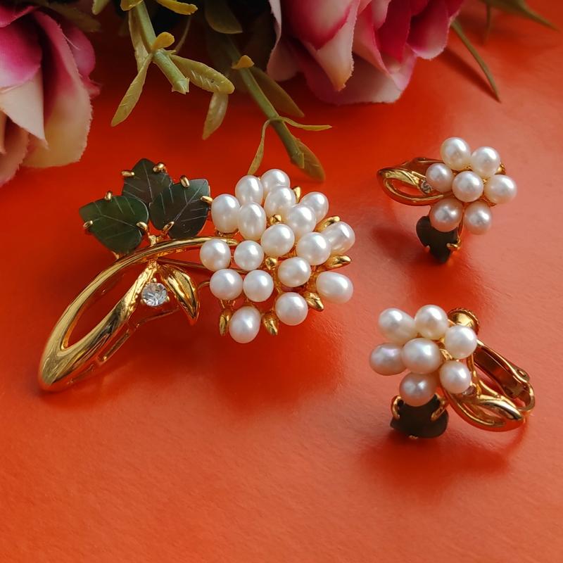 Элегантный и изысканный набор украшений из натуральных жемчужин и жада. Для тех, кто ценит шик в малых формах. Основа украшений выполнена из сплава металлов с плотным слоем позолоты. Цветочки из натуральных культивированных жемчужин, а листочки из ювелирного качества жада. Украшения новые, не использовались. В носке выглядят как ювелирные изделия. Набор отлично подойдет на подарок дорогому сердцу человеку или себе любимому. Размер брошки 3,5 х 4,8 см Клипсы на винтах 2 х 2,3 см Общий вес 118.3 гр