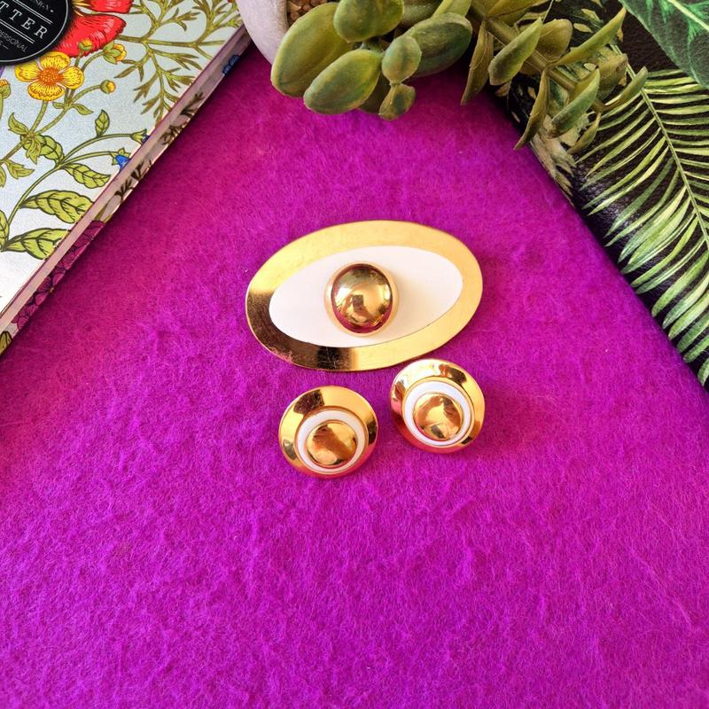 Элегантный комплект 60-70-х годов. И хотя маркировки на нем отсутствуют (кроме отметок патента на лапках клипсов), гарнитур имеет свой шарм, изюминку и ценность. Комплект состоит из овальной брошки и клипсов, выполненных в сочетании зеркальной золотистой полироли и белого эмалового акцента. Четкие формы, лаконичность и тот же геометрический шик, которым славились украшения 60–70-х годов в США. Состояние достаточно красивое. Имеются мелкие следы времени. 🔹 Возраст: 60-70-ые гг. 🔹 Страна: США. 🔹 Без маркировки, но с узнаваемой винтажной эстетикой 🔹 Диаметр клипсов: 2,5 см. Размер брошки: 4,1 х 6,5 см. Добавлен видеообзор.