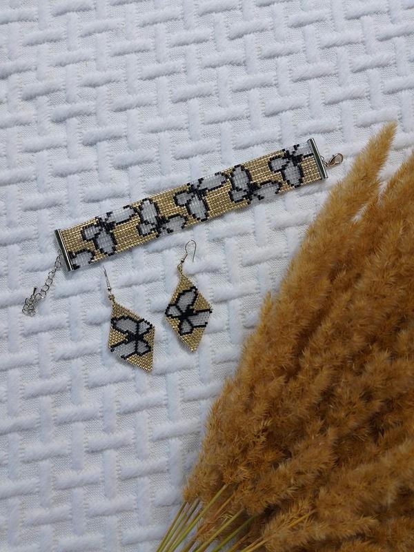Невероятный комплек из бисера изготовлен из качественного бисера miyuki delica (Япония). Размер бисерин 1.6мм. Очень красивый узор с бабочками. Очень красиво сверкает на солнце. Качественная серебристого цвета застежка. По краям укреплен двойной нитью, поэтому будет хорошо носиться не растягиваться, не протираться. Длины браслета без застежки 15 см., +6 см. длина цепочки. Ширина браслета 2.5 см, 16 рядов бисера. Серьги: длина - 4,5 см, ширина - 3 см. Комплект красиво дополнит как ежедневные так и праздничные образы) Также может стать хорошим подарком) Можно сделать в другом цвете)