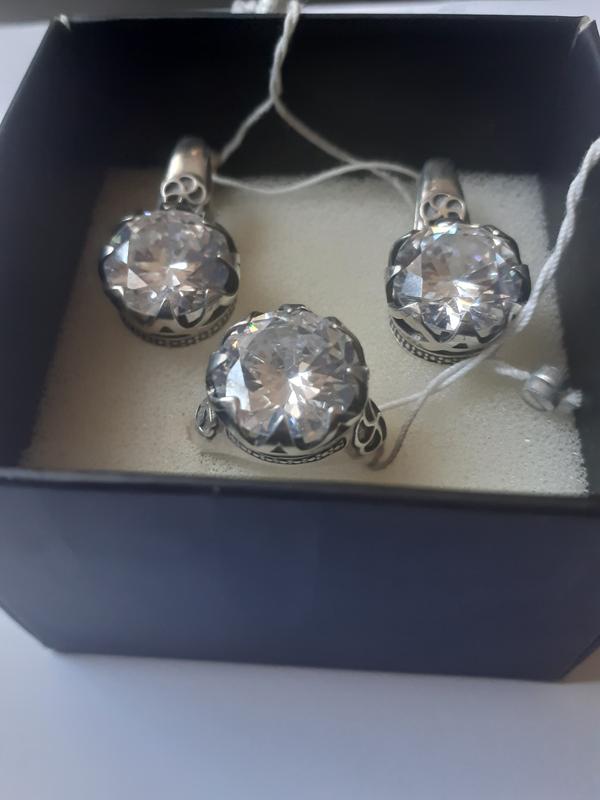 Каблучка Серебро 925 Родики обычное и черное Размер 18,5 Вставка кубический цирконий Вес 6,23 г Диаметр вставки 12мм Вес вставки 2.3 г На фианите присутствует царапинка в 1мм, заметная лишь с расстояния до 30 см и при специфическом угле обзора. Абсолютно незаметная при свете, особенно ярком/солнечном и если смотреть прямо или дальше нож с указанного расстояния под углом. Но тем не менее царапинка учтена в цене. Серьги Серебро 925 Родики обычное и черное Вставка кубический цирконий Вес 10,37 г Размеры серьги 29*14 мм Диаметр вставки 12 мм Вага вставок 4,6 г