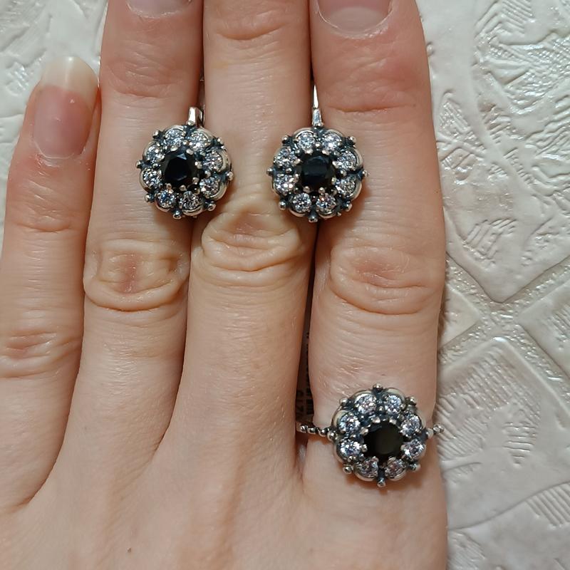 Серебряный набор 925 пробы пробы, бирки, опломбированные Вставка куб цирконий Вес кольца 3,9 гр Вес серег 6,7 гр Размер 18,0 черный