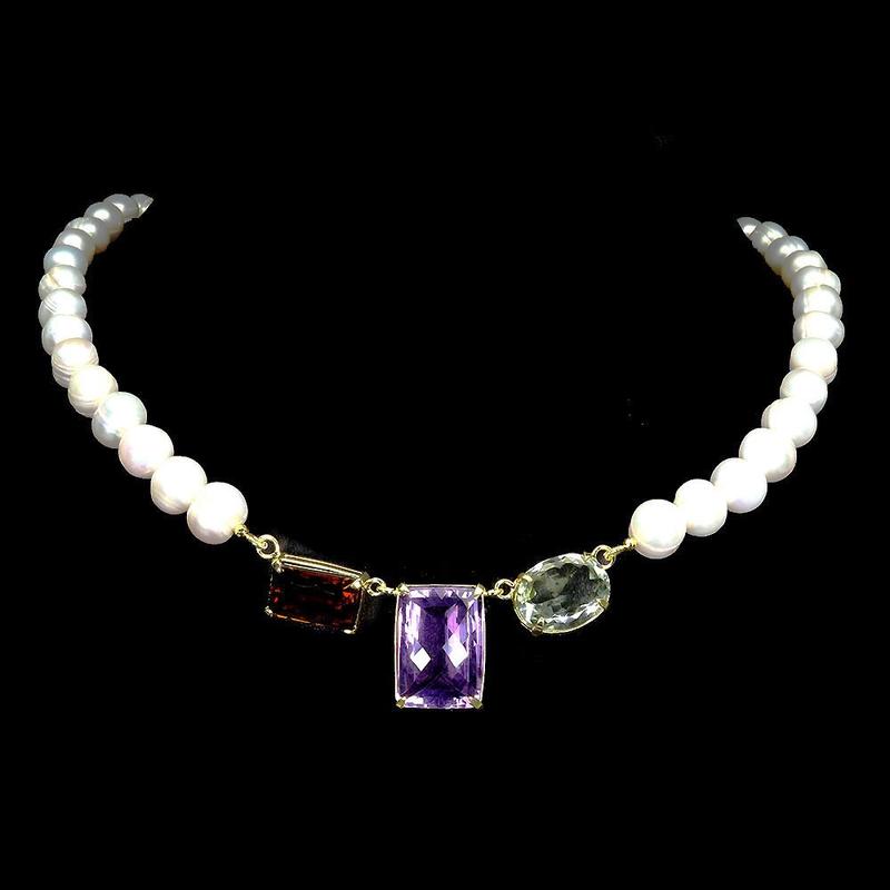 Колье с натуральным жемчугом, цитрином, аметистом и празиолитом (зеленым аметистом), сереб...