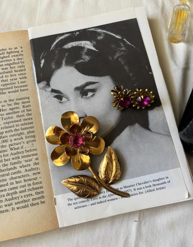 Брошка-Квітка -1100❣️ — це втілення ніжності, що не в'яне. Її пелюстки, виконані у відтінках теплого, патинованого золота, витончено вигнуті, ніби щойно розкрилися під першими променями сонця. У самому серці квітки палає яскравий, глибоко-малиновий камінь❣️ пара сережок, що додає образу грайливої, але розкішної нотки. Вони виконані у формі мініатюрних золотих квіточок -650📮прикрашених тим же насиченим, магічним пурпуровим каменем. Цей глибокий колір символізує роялті та пристрасть, а золоті промінчики навколо змушують їх сяяти