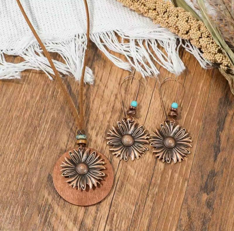 🏵️🌿 Оригинальный набор кулон+ серьги выполнен в стиле бохо с этническими мотивами из ювелирного сплава цвета античную медь. Кулон из дерева. Вставка на кулоне и серьги - цветочки из сплава под медь одинакового размера. Кулон на шнурке из эко-замши. Шнурок завязан на узелок, которым можно регулировать длину. Швенза-дужка медного цвета. Размеры: серьги 6 см вместе со швензой, кулон - деревянный круг 4,5 см, цветок - 3,5 см. Состав: дерево, ювелирный сплав под медь, эко-замша.